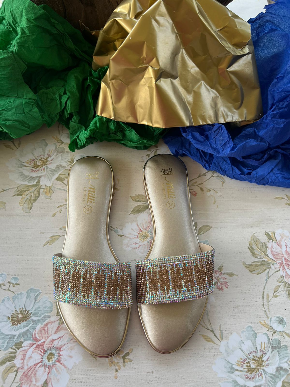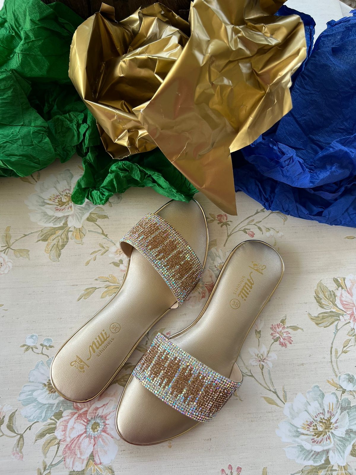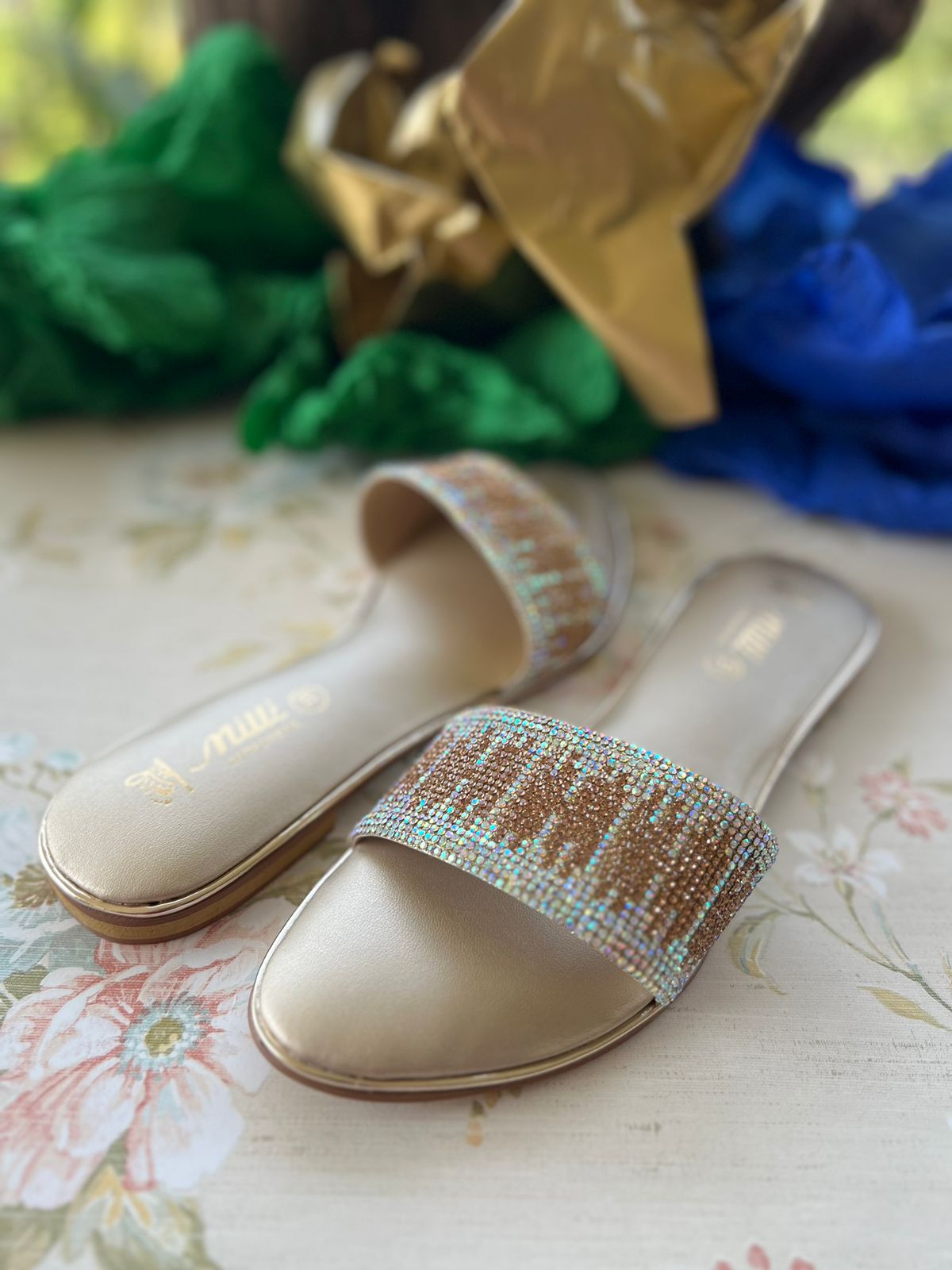 Elevate your style with these Semi Formal Slides. The heavily embellished 2 tone Diamentes upper features a dazzling design in rainbow silver and golden stones, adding a touch of glamour to any outfit. Plus, the foam cushioned insole provides all-day comfort. Perfect for any occasion!