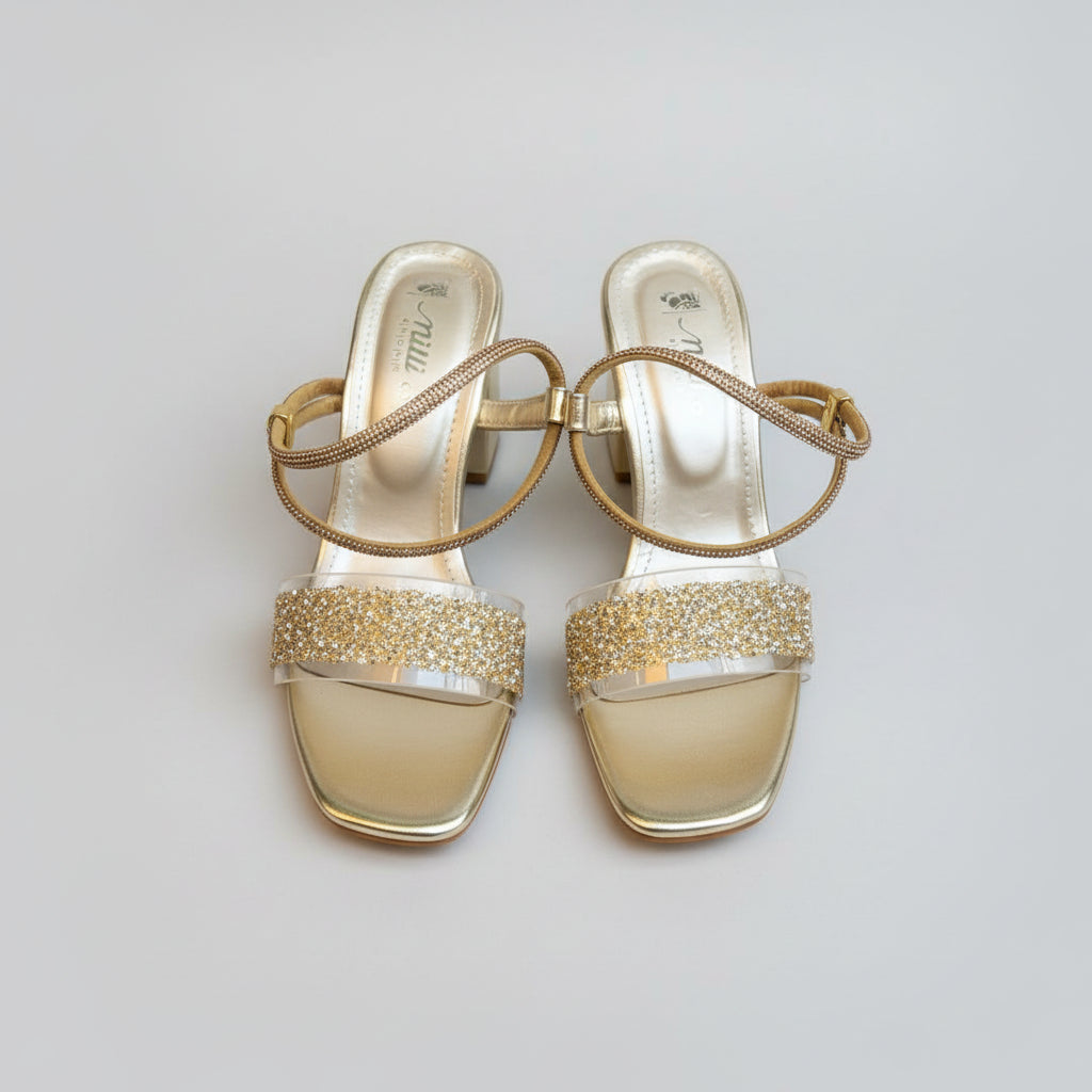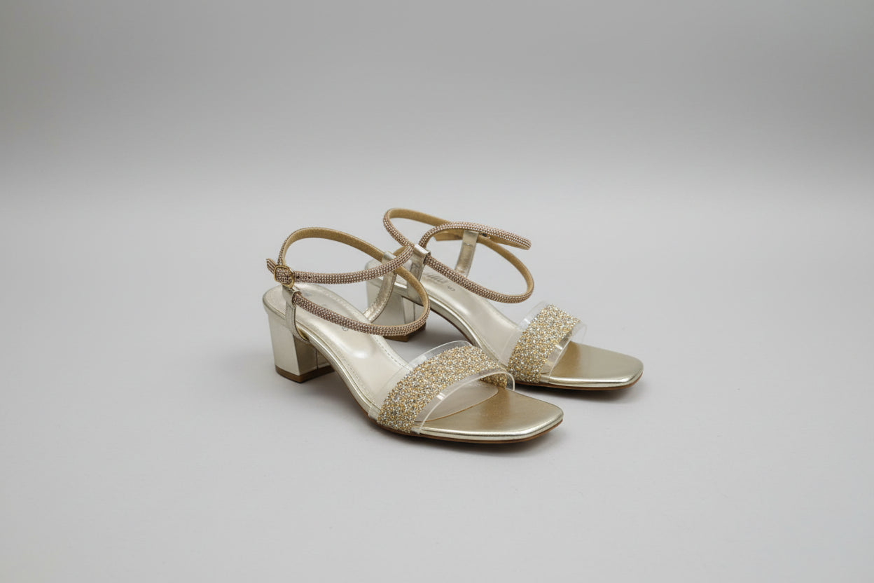 Elevate your step with these stunning block heel sandals featuring a single glittery strap adorned with rhinestone studs. The rich golden color catches the light beautifully, while the comfortable 3-inch block heel provides all-day wearability without sacrificing style. Perfect for weddings, parties, or any occasion where you want to shine.