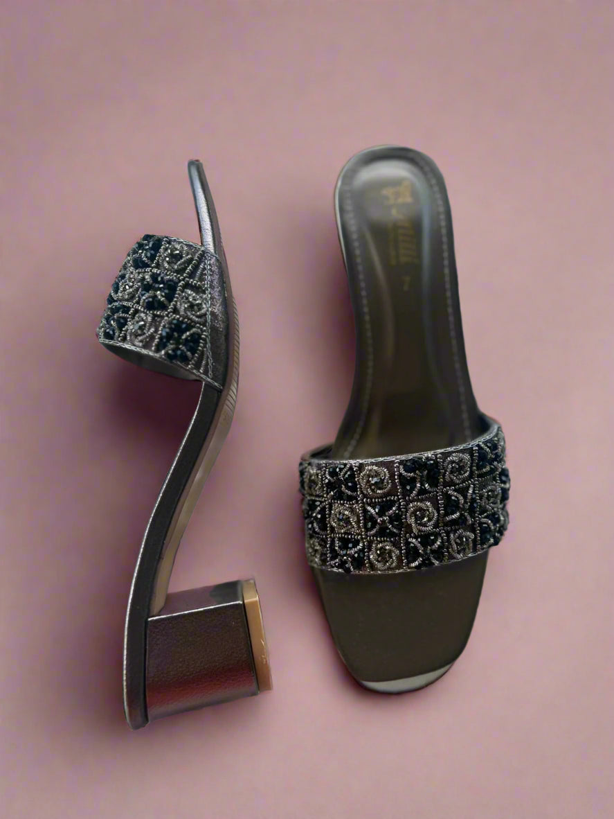 Step into the festive season with these Fancy Black Heels, featuring hand-embroidered metallic grey and black accents, sparkling stones, dabka, tilla, and beads. The 1-inch high block heel offers just the right lift while the soft, high-quality rexine ensures comfort all night. Perfect for adding a touch of sparkle to your celebrations!