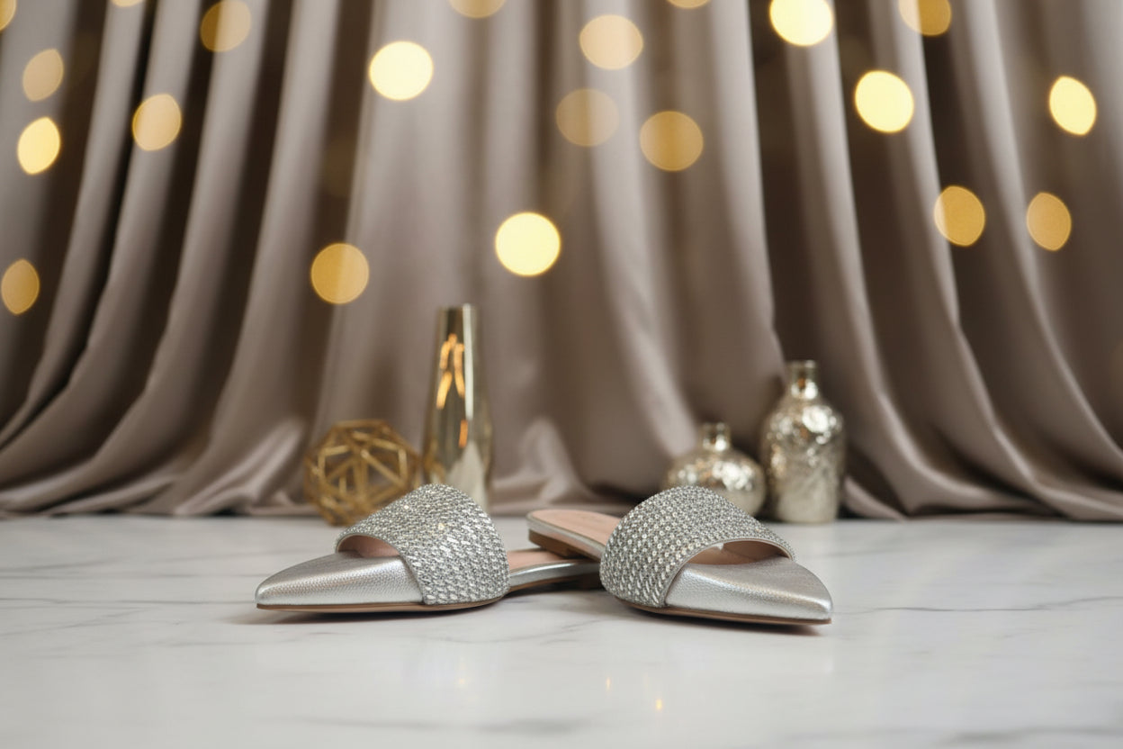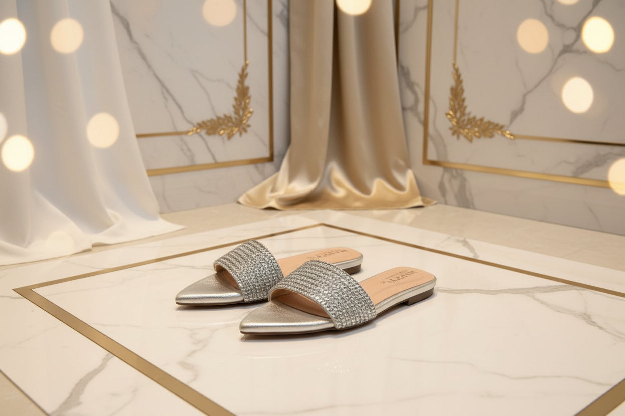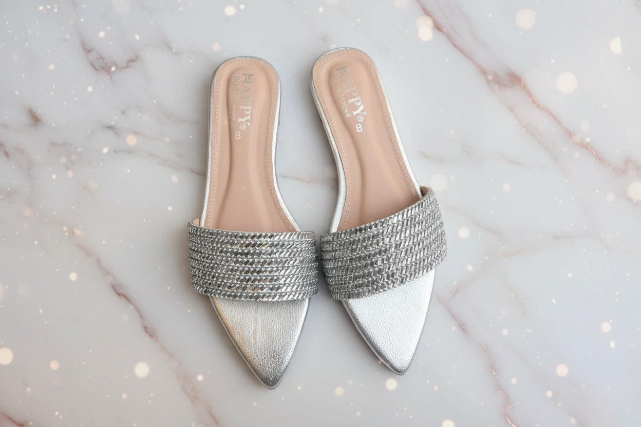 Elevate your style with these stunning Fancy Slides featuring a sleek rectangle-shaped rhinestone upper that catches the light beautifully. The silver-toned design pairs effortlessly with any outfit, while the pointed-shape sole adds a contemporary edge. Designed for all-day comfort, these trendy slides boast a cushioned insole that supports your feet and a flat sheet sole for stability.
